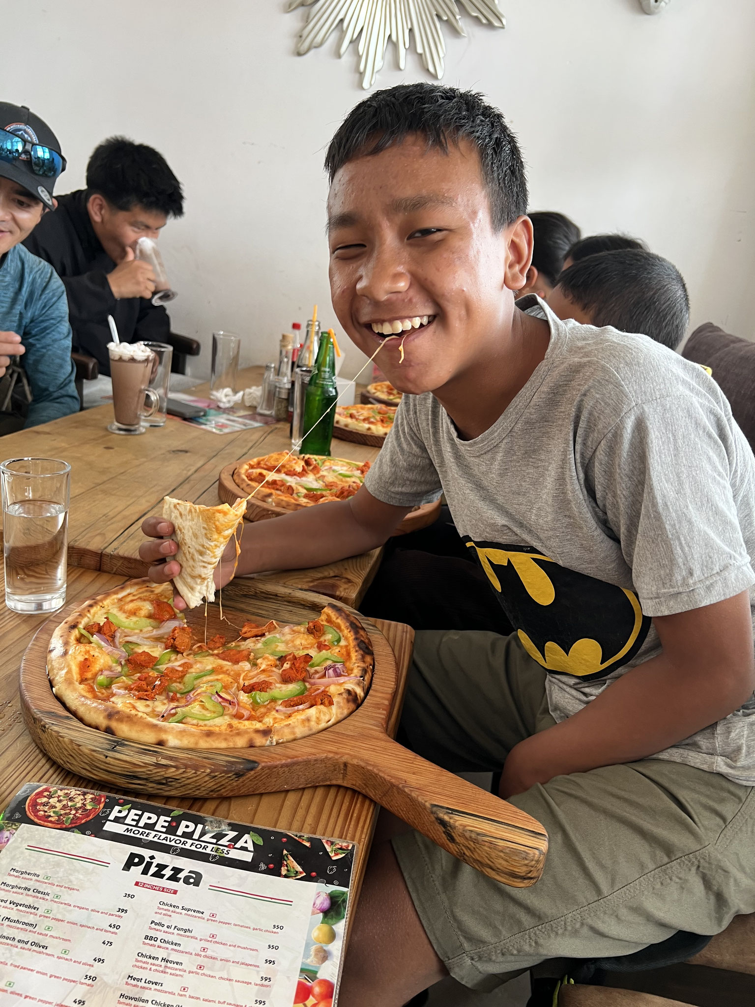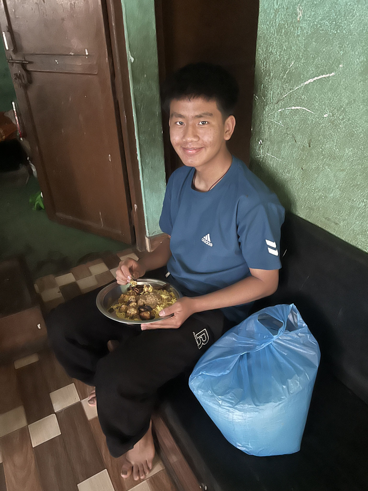 Jeder ankommende Gast wird nach nepalesicher Tradition mit Blumen begrüsst. Die Kinder schenken mir jeweils selbstgemachte Zeichnungen. Zur Begrüssung wird ein Festmahl mit MOMOS für alle zubereitet. Drinnen wird gekocht. Draussen gegessen und abgewaschen.