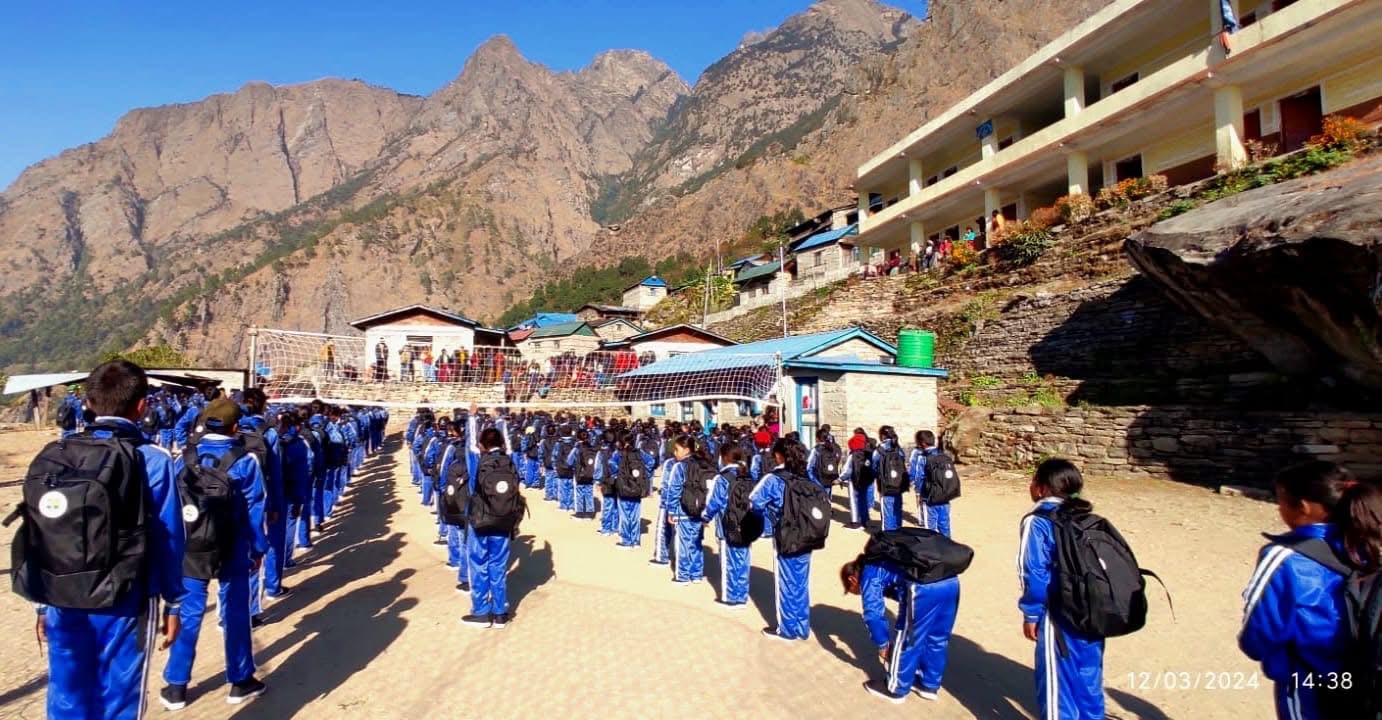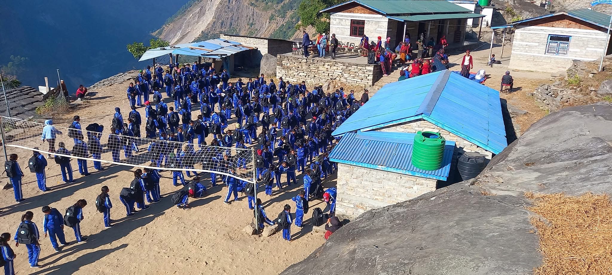 Schuluniformen, Rucksäcke und Unterrichtsmaterial wurde in diesem Bergdorf an 200 Schüler und Schülerinnen verteilt durch Som Bahadur.