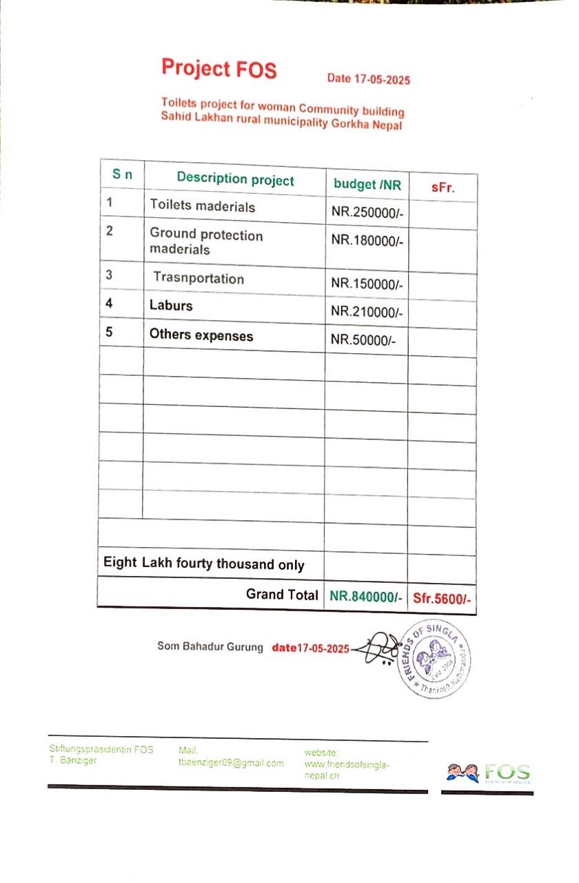 Ein kleines Bergdorf im TsumValley hat bis heute noch keine Toiletten für jedes Haus. Gemeinsam mit dem Dorfvorsteher wurde das Projekt geplant. Unsere Stiftung hat das Material und den Transport ins Bergdorf finanziert. Die Dorfbevölkerung hat in zwei Monaten für jedes Haus (22 Häuser) eine eigene kleine Toilette gebaut und für die Frauen einen eigenen Waschraum. Ein Projekt für eine kleine Solaranlage für warmes Wasser steht auf unserer Pendenzenliste. Gemeinsam mit Som Bahadur und der Dorfbevölkerung wurde Ende Mai das Projekt abgeschlossen und gefeiert.